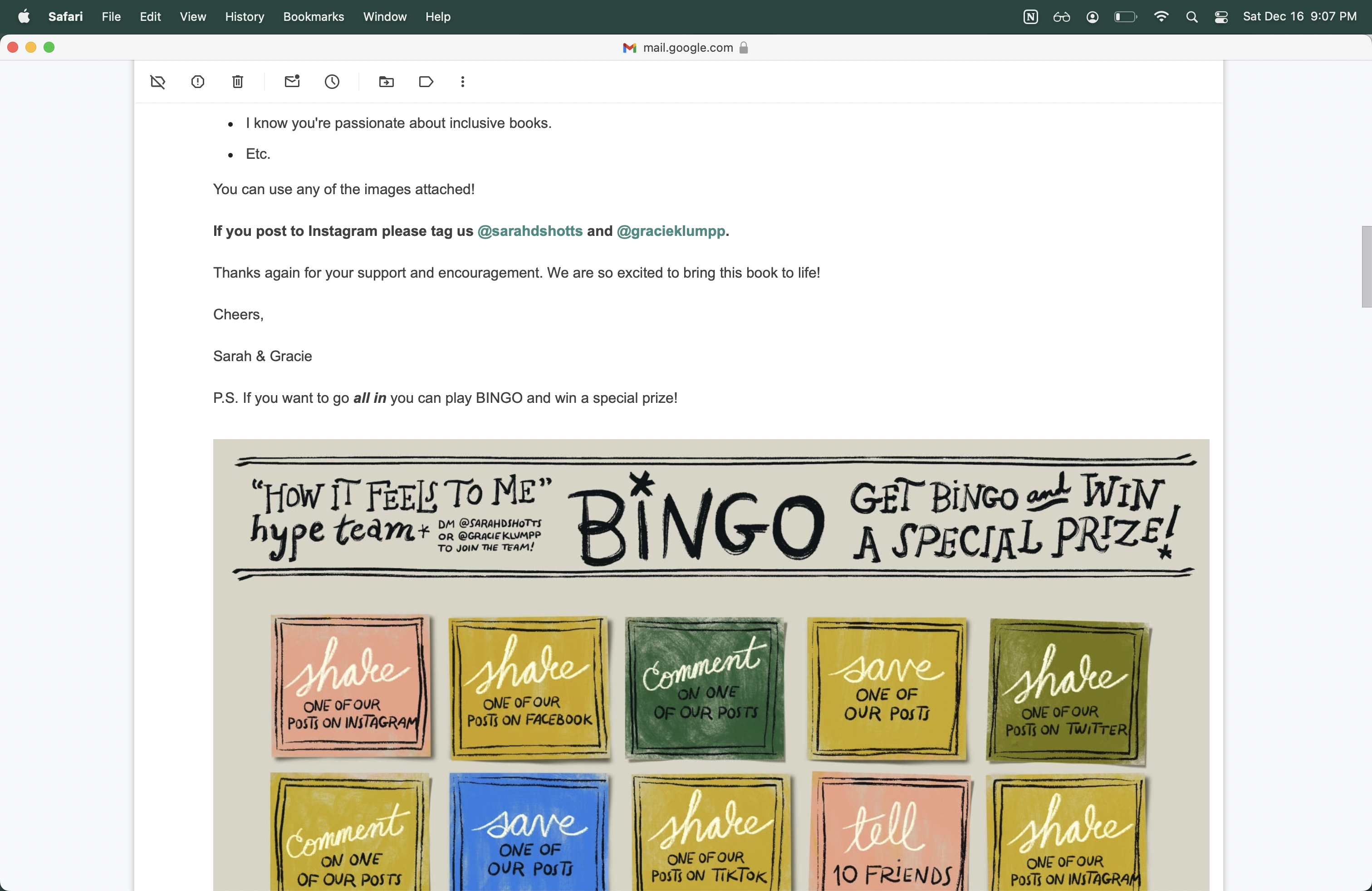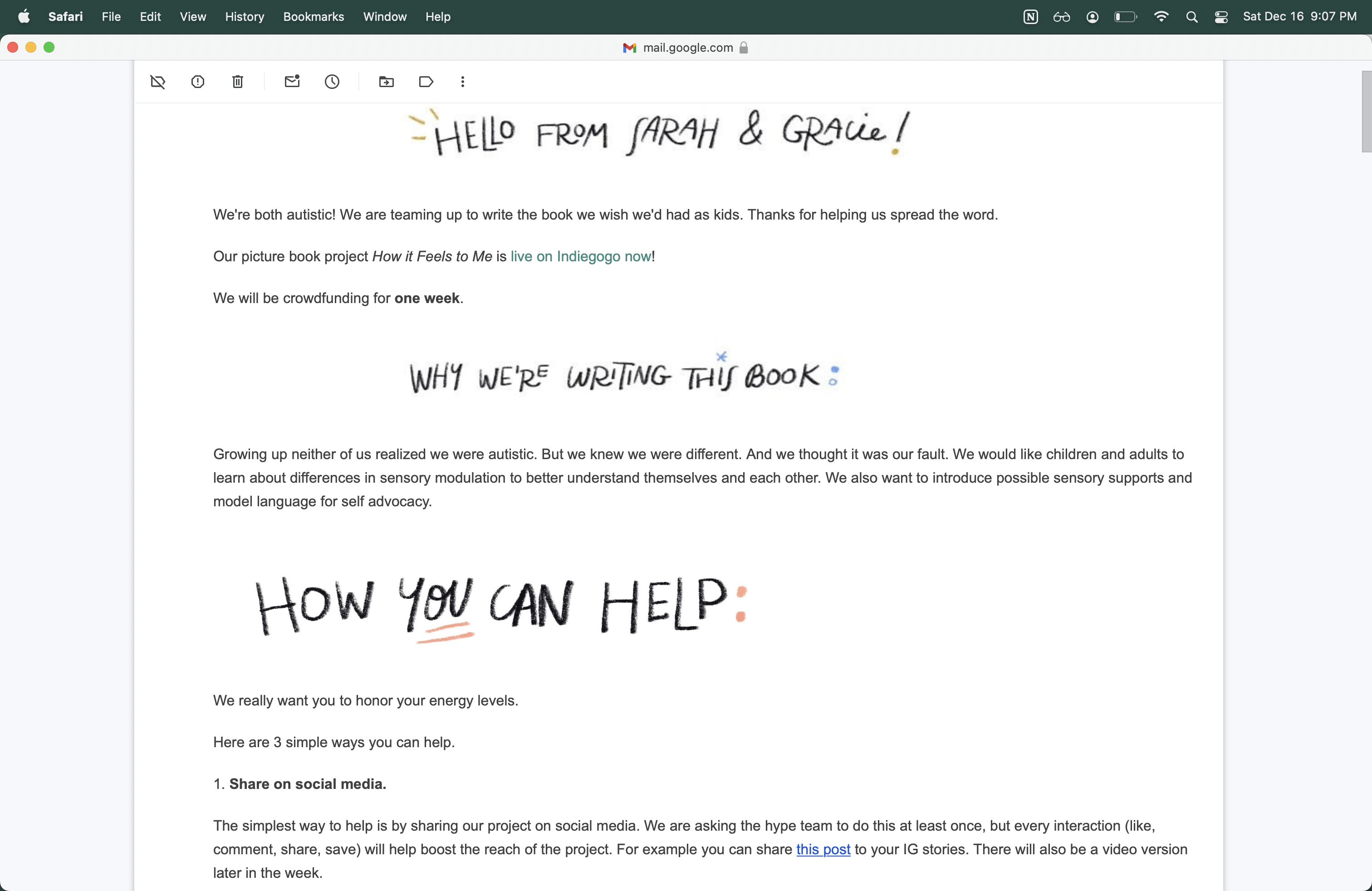 Here are some screenshots of the email we sent our Launch Team for How it Feels to Me. They were really instrumental in our success in reaching our goal in a short whirlwind campaign.